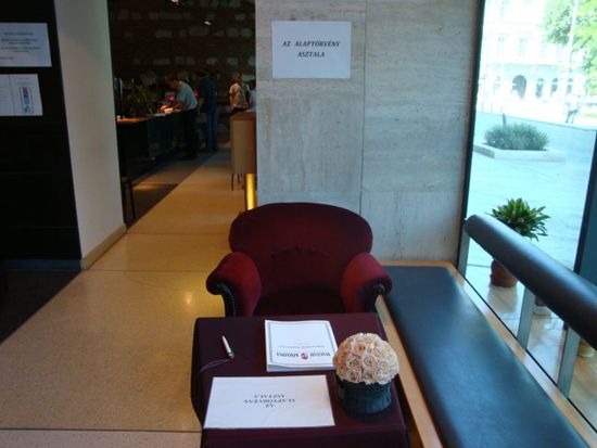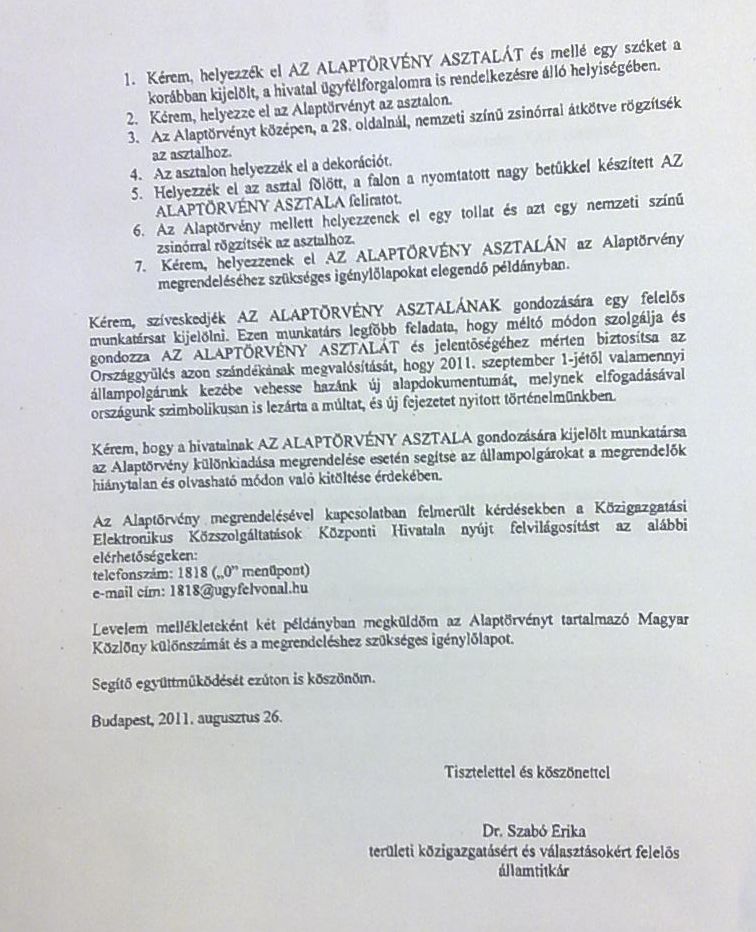 "A kormány arra kéri az önkormányzatokat, hogy szeptembertől lehetőség szerint a polgármesteri hivatalban, az ügyfélszolgálatukon állítsanak fel egy asztalt, az alaptörvény asztalát, ahol az állampolgárok egy adatlap kitöltésével személyre szólóan kérhetik az új alkotmány névre szóló kézbesítését. Az erről szóló hivatalos felkérést a napokban kapják meg az önkormányzatok a Közigazgatási és Igazságügyi Minisztériumtól. Az országban elsőként Budapest V. kerület önkormányzata teremtette meg e lehetőséget az ügyfelei számára, az alaptörvény igényléséhez.A kormány ily módon is szeretné lehetővé tenni, hogy Magyarország új alaptörvénye bárki számára megismerhető, elérhető legyen, és egyúttal - a közelgő hatályba lépés alkalmából - személyre szóló emléktárgy is lehessen."